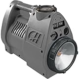 Rechargeable at home or in the car. 4 amp/hour battery. Bright work light and a built-in pressure gauge. Fused for overload protection. Cooling fan gives extended unit life and reliability. Extra outlet to provide power to run most 12 volt products. Storage for hose, adapter, and included accessories: two inflation nozzles and one inflation needle for sports balls. 9.12" height x 11.88" width x 6.12" length, 8.7 pounds.