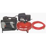 The Porter-Cable CFBN125B 1 1/4-inch Brad Nailer and Compressor Combo Kit includes everything you need to start working right away--including a six gallon 150 PSI compressor, a 1-1/4-inch 18-guage brad nailer, a 25-foot air hose with coupler and plug, 1,000 brad nails, nailer oil, and a carrying case. The compressor's 150 Max PSI allows users to drive more nails than a traditional 135 Max PSI compressor and its six gallon tank allows users to drive a large quantity of nails on a single tank charge. The compressor operates at 2.6 SCFM at 90 PSI for quick compressor recovery time and features an oil-free pump design for maintenance-free durability. Other compressor features include a 120-volt electric motor to run the compressor on a standard house hold current and the 10 Amp current draw allows users to use compressor with a 16-gauge or heavier extension cord (50 feet or less). The included BN125A nailer uses standard 5/8-to-1-1/4-inch 18-guage brads. Other nailer features include a special hardened driver blade for maximum durability and reliability, a tool-free jam release mechanism designed not to block the line of sight for uninterrupted work, and a strong and lightweight die-cast aluminum body for maximum durability and reliability.